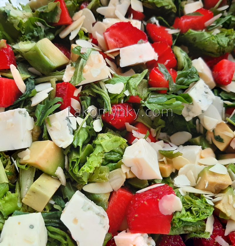 Пучок салатного листяПучок руколи1 авокадоСік лайма5 полуниць100 г горгонзолиЖменя мигдальних пластівців1 ст. л. бальзамічного оцту1 ст. л. оливкової олії1 ч. л. меду Листя зелені порізати, авокадо порізати кубиками і вимішати з соком лайму, полуниці і сир порізати кубиками, посолити, вимішати олію з оцтом і медом, заправити, посипати мигдалем.