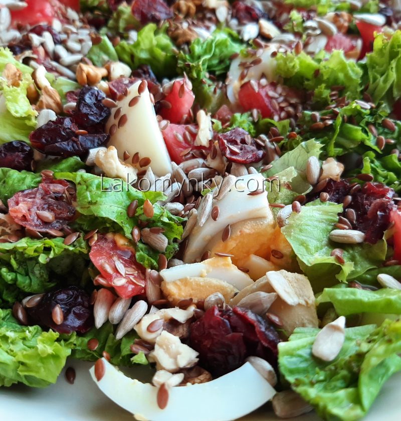 2 пучки салатного листяПучок руколи (можна теж трохи порею)2 ст. л. соняшникового насіння2 ст. л. сушеної журавлини2 помідори2 зварені яйця1 ч. л. льону1 ст. л. бальзамічного оцту1 ст. л. оливкової олії2 ст. л. волоських горіхів, порізати Листя салату, руколи і порею порізати, яйце і помідор порізати кубиками, додати насіння, журавлину, льон, горіхи, посолити, вимішати олію …
