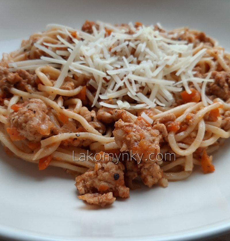 Тісто:100 г борошна1 яйця Соус:400 г свинної корейки (змолоти на грубому ножі)100 мл білого винаСушені травиПармезан для подачіСіль, перець300 г помідорів1 цибулина150 мл м’ясного бульйону (води)1 скл. тертої моркви0,5 червоного перцю (не обов’язково) Дрібно порізану цибулю протушкувати на маслі, влити вино (щоб випарувалось), додати бульйон, змелені помідори, моркву і перець, спеції, трави і свинину. Замісити …