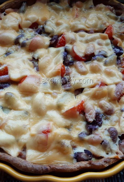 Дріжджі розчинити в теплому молоці, додати решту складників на тісто, замісити і залишити на годину. Розкачати тісто, викласти на велике деко від духовки, поколоти, зверху помастити сиром, зверху викласти посмажену свинину і цибулю. Пекти 25 хв при 230ᵒС.