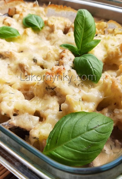 Цибулю дрібно порізати і підсмажити, додати грубо порізане філе, спеції і обсмажити на сильному вогні, все разом змолоти. У помащену форму для запікання викласти тонкі кільця кабачка, зверху філе, ще раз шар кабачка і філе. Поверх викласти помідори. Сметану і яйця збити, додати сіль і перець, залити запіканку і посипати пармезаном. Запікати 25 хв при 200ᵒС.