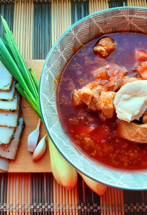 В глибокій пательні розігріти масло і обсмажити до прозорого порізану цибулю, видавити часник. Додати горошок і помішуючи коротко протушкувати, влити бульйон, додати шашлик і варити 15 хв. Витягти шашлики, додати сметану і спеції, прокип’ятити, перебити блендером, додати подріблений шашлик, пармезан.