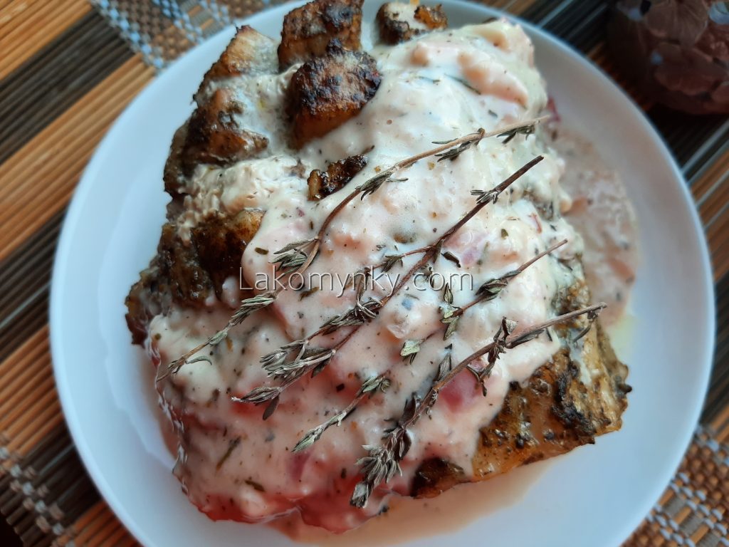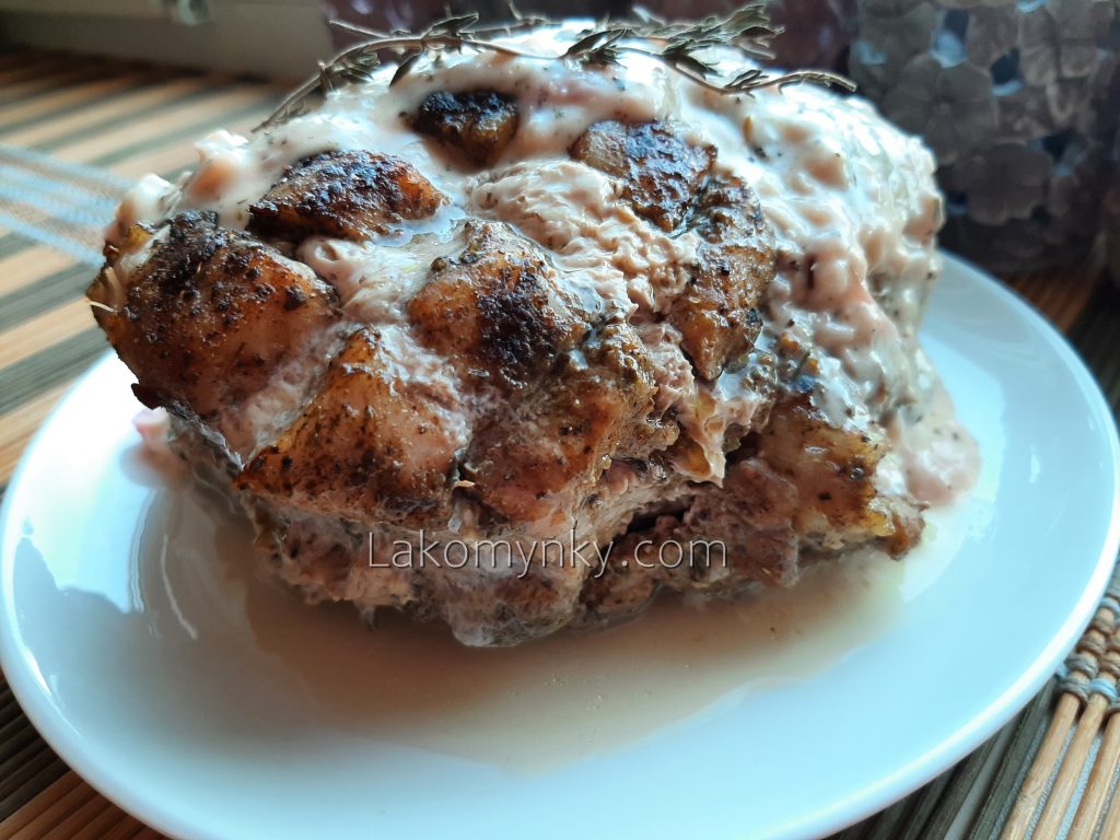 М’ясо зверху надрізати, натерти весь шматок спеціями, часником і олією. Загорнути у фольгу і запікати приблизно годину при 200ᵒС. В кінці відкрити фольгу щоб верх запікся.