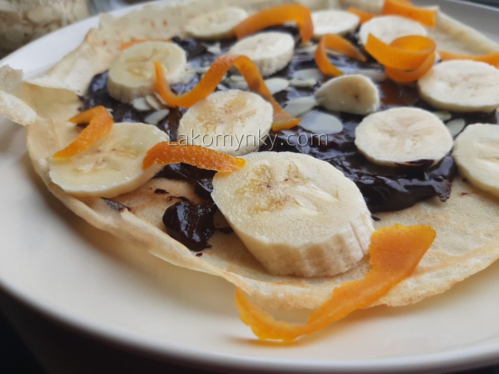 Налисники помастити шоколадом і додати порізані банани.
