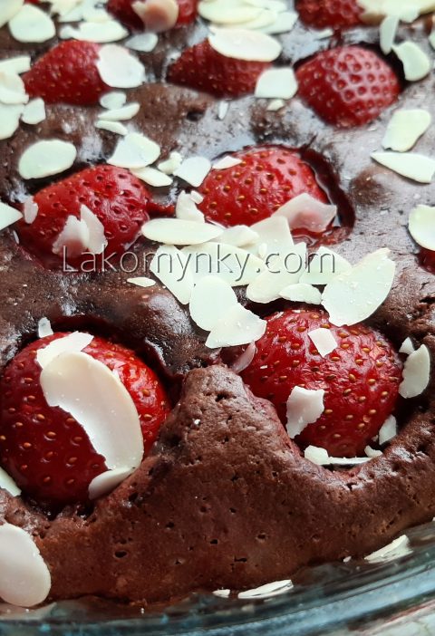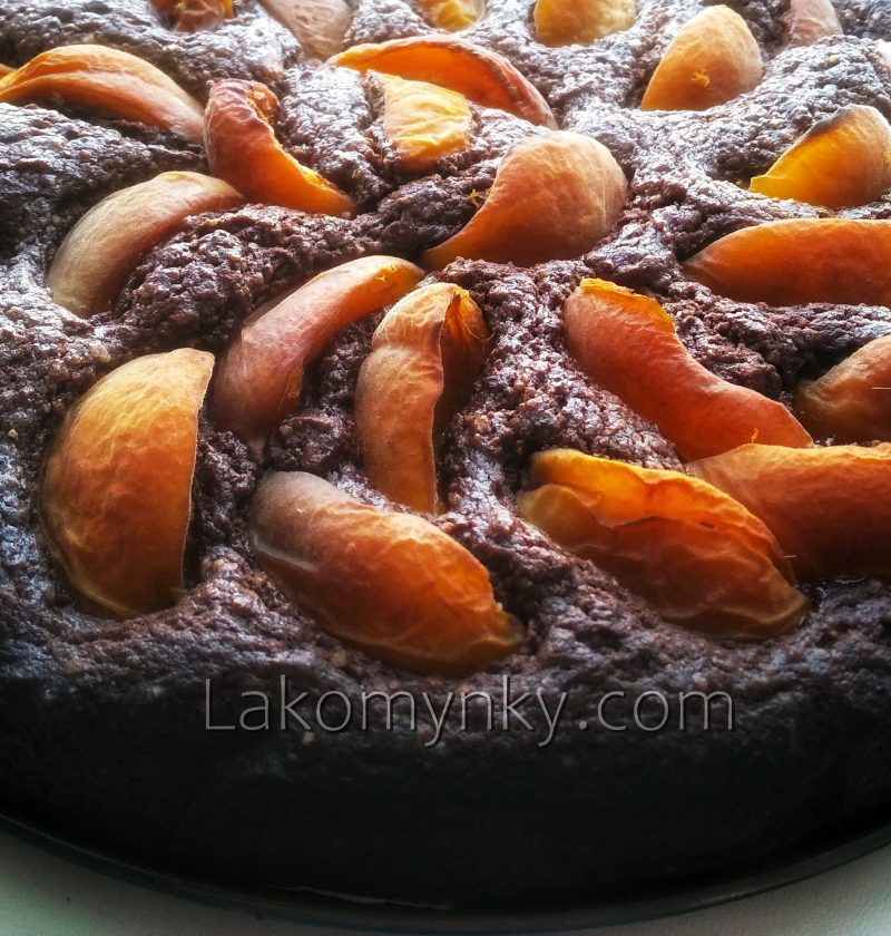 Масло збити міксером з цукром і яйцями, окремо змішати какао, борошно, порошок, змелені горіхи і додати по трохи, доливаючи молоко. Викласти тісто у круглу форму на пергамент (діаметр 26 см), зверху повтискати половинки абрикосів. Пекти 50 хв при 180ᵒС. Готовий присипати цукровою пудрою.