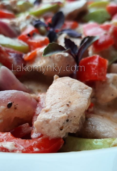 2 заморожені філе качки ніч вимочувати. М’ясо посолити, поперчити і обсмажити. Синю цибулину дольками і в сковорідку. Додати дольки 2х яблук і мандаринки, вино, сушені трави і цукор. Перекласти в духовку. Запікати при 180ᵒС 15 хв.
