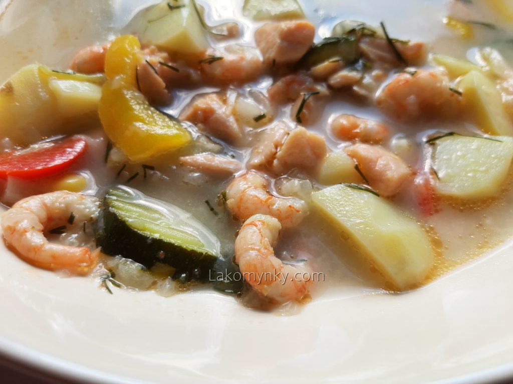 Воду закип’ятити, посолити, картоплю кубиками, варити, додати дрібно порізану і посмажену цибулю. Додати порізаний кубиками лосось, часник, сметану, морожені овочі, порізаний кріп і вимішати. Поперчити. Додати підварені (і почищені) креветки (можна опустити).