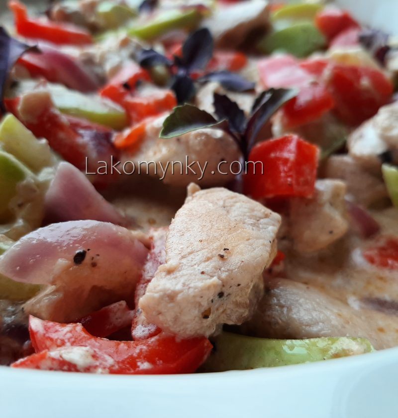 2 курячі філе0,5 кг баклажанів1 зелений перець200 г сметани0,5 ч. л. хмелі-сунеліСіль, перець3 ст. л. пармезану1 цибулина Баклажани почистити і порізати кубиками, посолити і залишити на 15 хв. Промити їх і протушкувати з дрібно порізаними цибулею і перцем.Філе порізати кубиками, додати до овочів, додати спеції, сметану, обсмажити.Викласти у форму для запікання, посипати тертим пармезаном. Запікати …