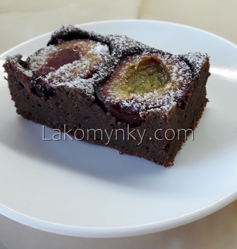 150 г чорного шоколаду3 яйця70 г волоських горіхів, змолоти130 г масла150 г цукру280 г борошна1, 5 скл. молока4 ст. л. какао2 ч. л. порошку до печиваДрібка соліСливи Шоколад стопити на водяній бані з маслом, міксером збити яйця з цукром і шоколадом, додати какао, борошно з порошком, горіхи і сіль, розбавляючи молоком. Тісто має бути не …