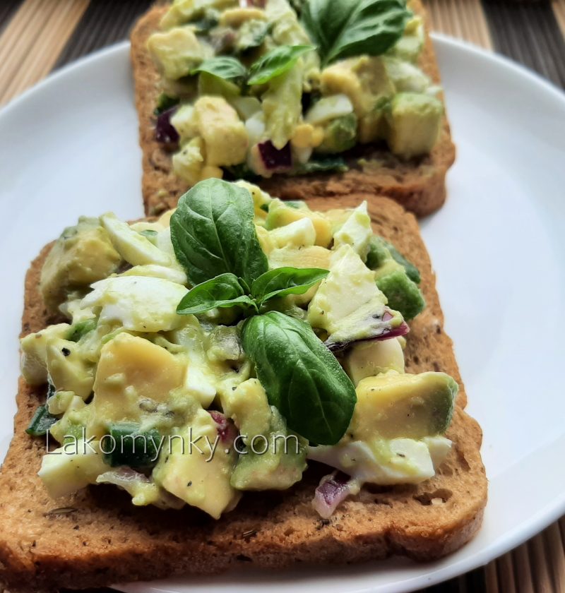3 яйця1 стигле авокадо1/5 синьої цибуліПучок зеленої цибуліМоцарела в кульках (100 г)Сік одного лаймаСіль, перець2 ст. л. сметани Авокадо і цибулю дрібно порізати і вимішати з соком лайма на 3 хв. Зварені яйця, зелену цибулю і моцарелу дрібно порізати, додати спеції і заправити сметаною.